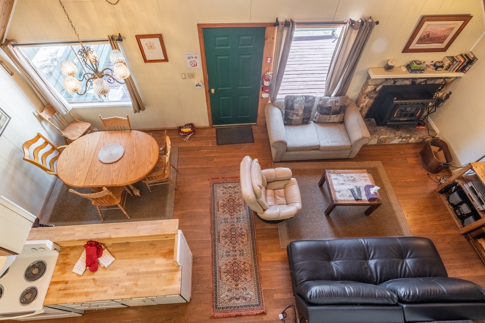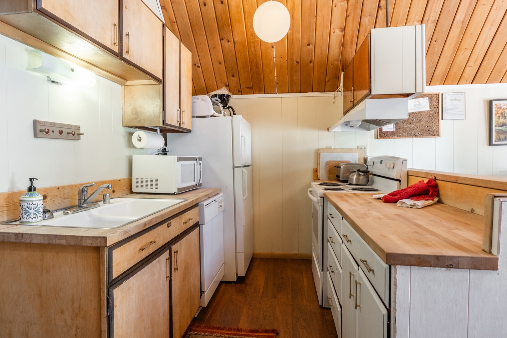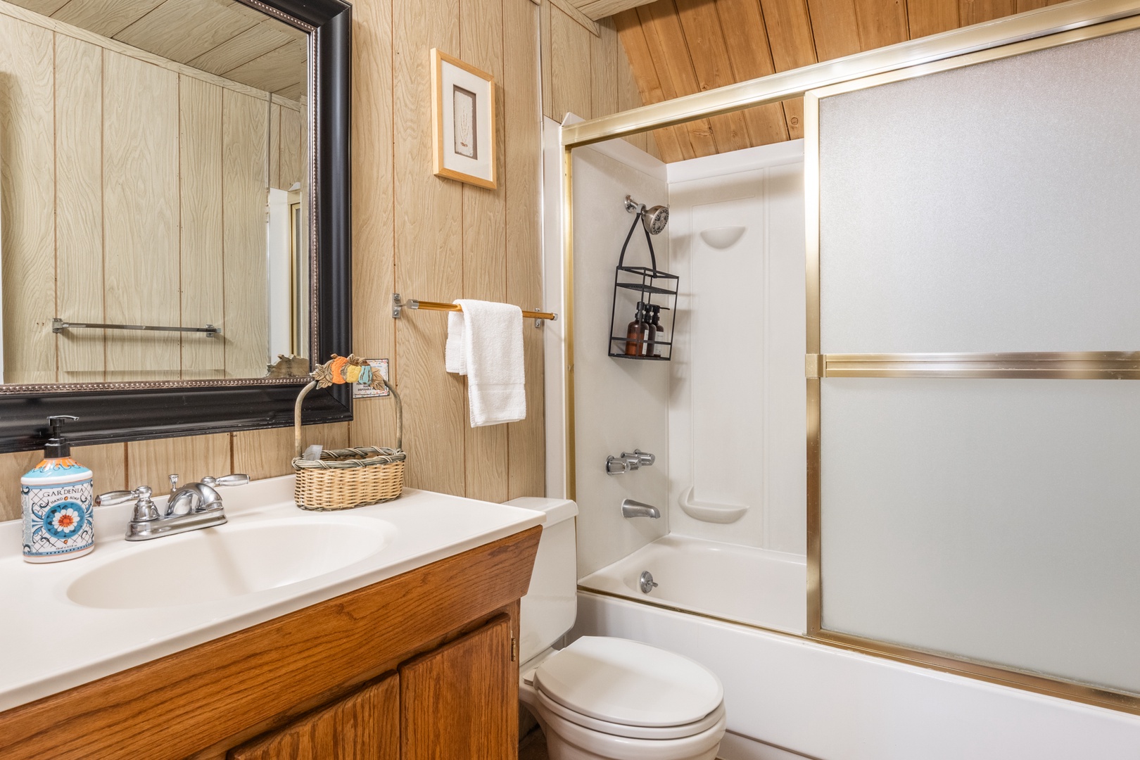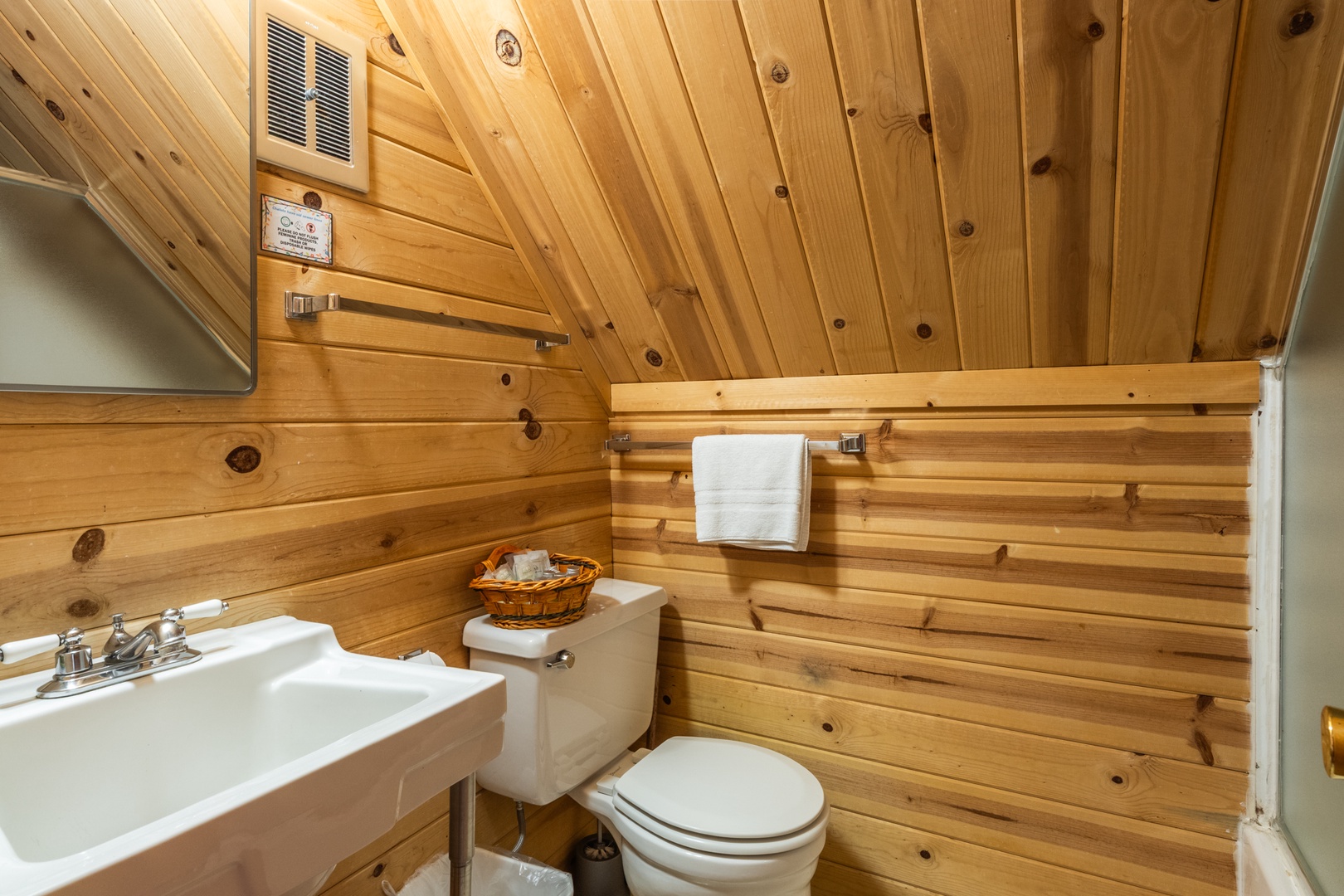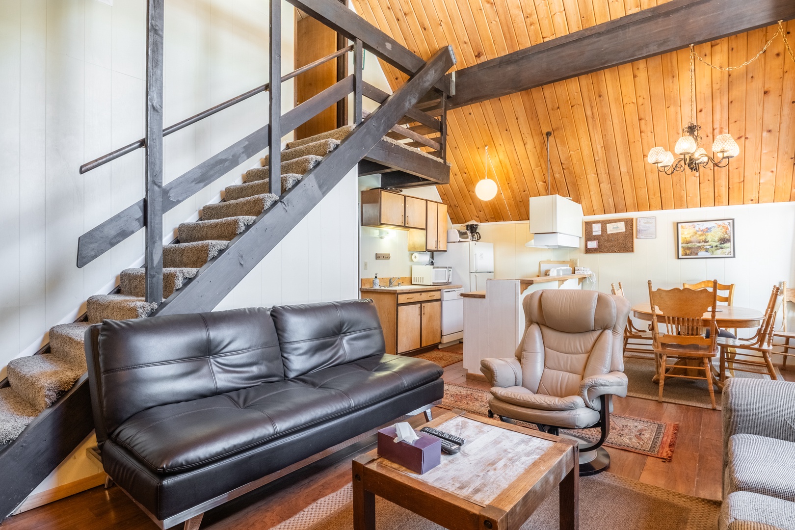 This Chalet is categorized as one of our Medium size units and maintains much of its' original charm. It has 3 bedrooms and 2 bathrooms. Upstairs, there is 1 bedroom with a Queen bed and 2 Twin beds with a full bathroom. Downstairs, there is a full bathroom as well as 1 bedroom with a King bed, and another bedroom with 2 Twin beds. You can enjoy the fully equipped kitchen, dining area, and living room with a fireplace containing a wood burning insert, flat screen TV with Cable, DVR and DVD. This unit is Pet Friendly.