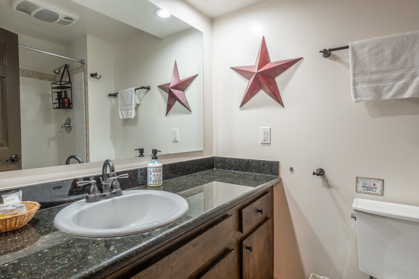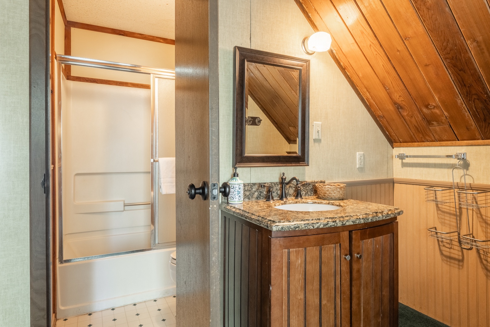 This spacious Chalet is categorized as one of our Large size units with a magnificent mountain view and large deck. It has 3 bedrooms and 3 bathrooms. Upstairs, there is a full bathroom and 1 bedroom with 1 Twin bed plus a bunk bed with a Double and Twin bed as well as a Twin trundle. Downstairs, there are 2 bedrooms each with a King bed and their own bathroom. Off the main living area there is a nook with a Full size sofa-bed and flat screen TV. You can enjoy the fully equipped updated kitchen with newer appliances, dining area, and large living room with a wood burning fireplace and flat screen TV with Cable, DVR and DVD. This unit is Pet Friendly.