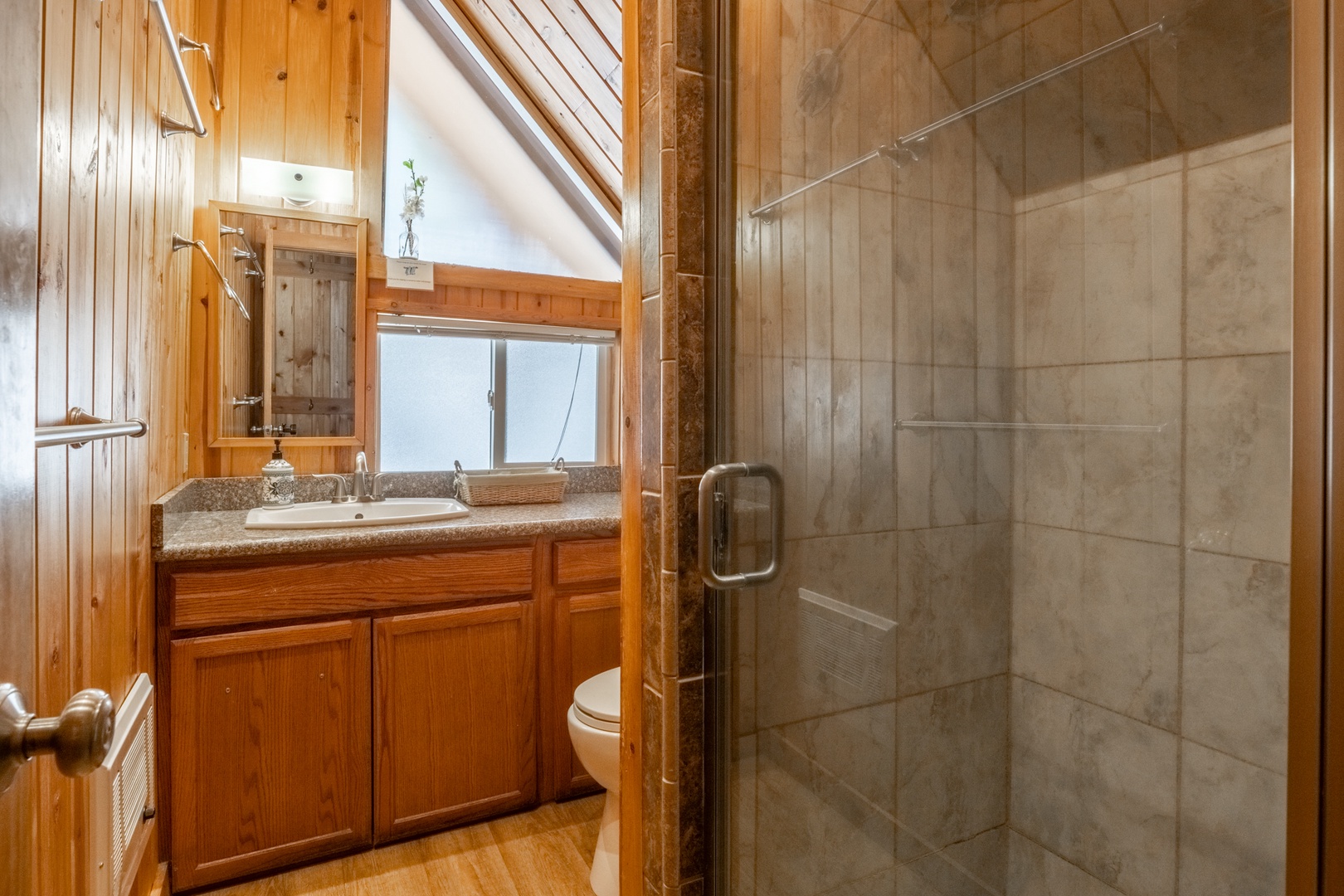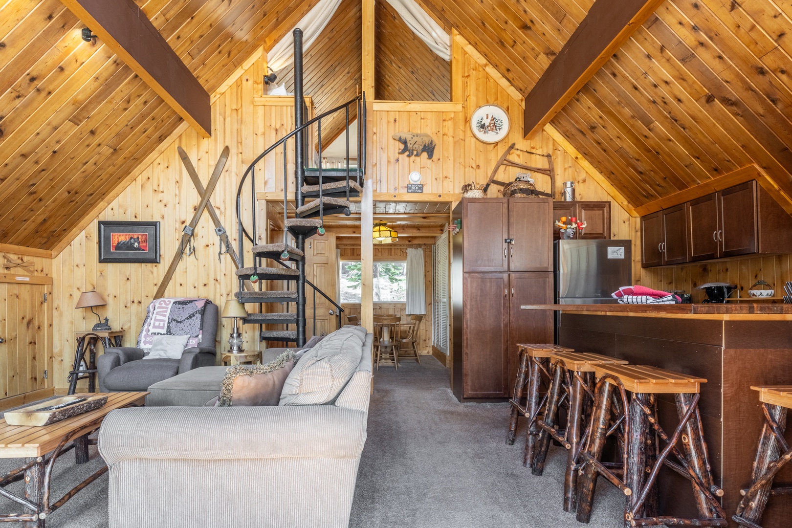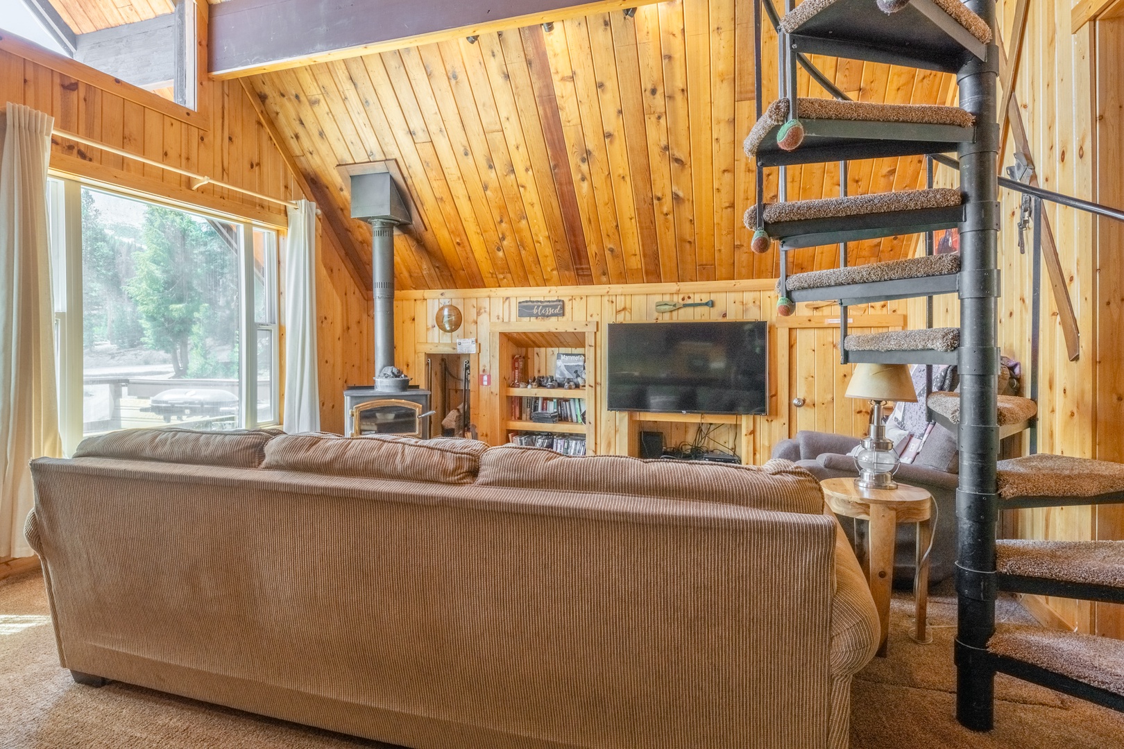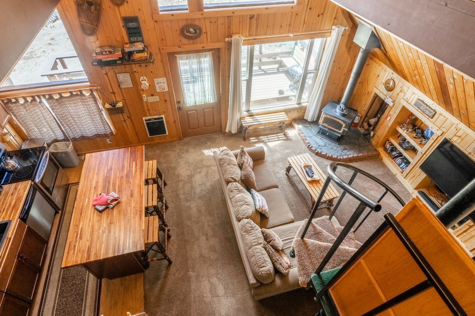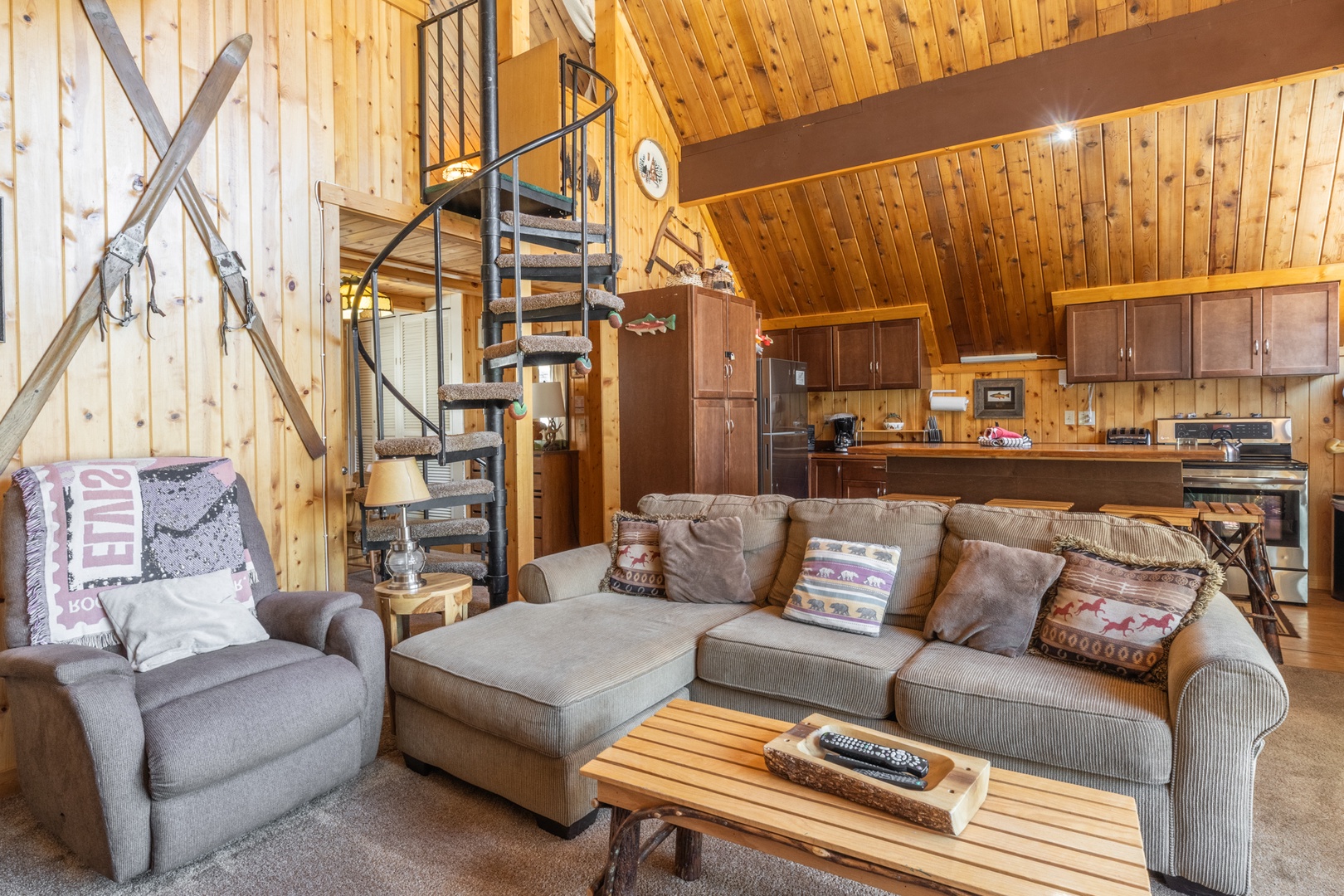 This cozy Chalet is categorized as one of our Small size units and enjoys an open floorplan with a wonderful view of the mountain and large deck. It has 1 bedroom and bathroom downstairs with a loft upstairs. The bedroom downstairs has a Queen bed and TV. The upstairs has a loft with 2 Twin beds with a Queen Trundle, TV, and a sink in the corner for convenience. There is a fully equipped kitchen, dining area, and living room with a wood burning stove, Queen sized sofa-bed, and flat screen TV with Cable, DVD and DVR. This unit is Pet Friendly.
