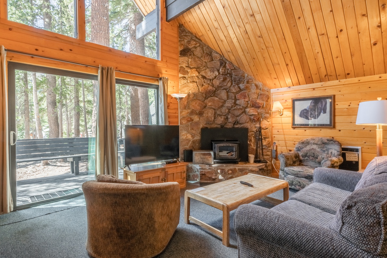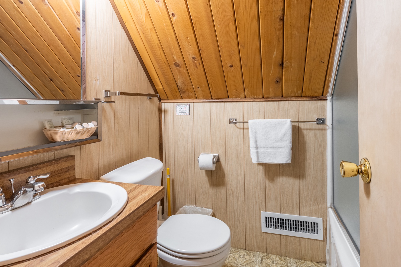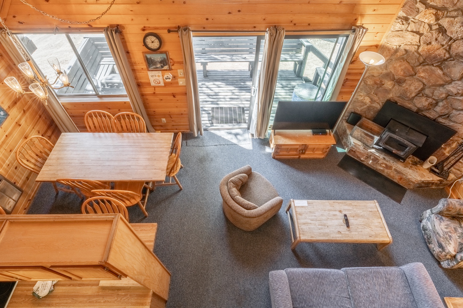 This Chalet is categorized as one of our Medium size units. This is a kid friendly, pet friendly unit! It has 3 bedrooms and 2 bathrooms. Upstairs, there is 1 bedroom with a 2 Twin beds and full bathroom. Downstairs, there is a full bathroom as well as 1 bedroom with a King bed, and another bedroom with 2 Twin beds. Additionally, there is a Queen sofa-bed in the living room. You can enjoy the fully equipped kitchen, dining area, and living room with a wood burning stove and flat screen TV with Cable, DVR, and DVD. This unit is Pet Friendly and has a washer and dryer.