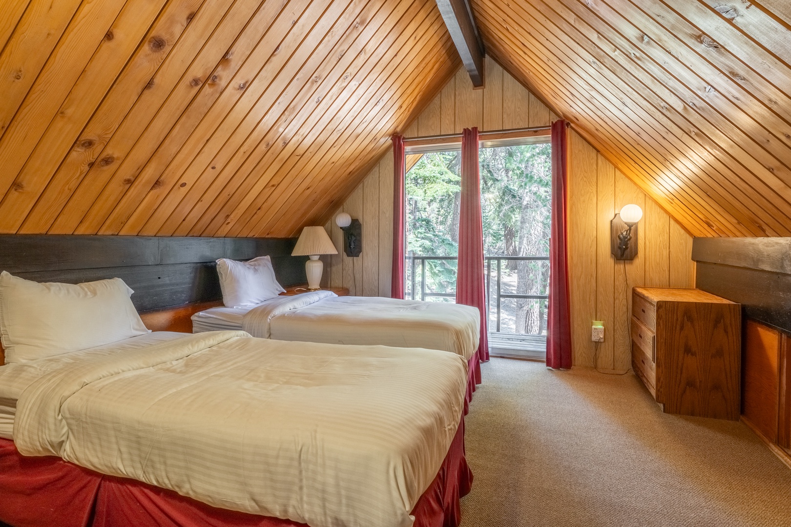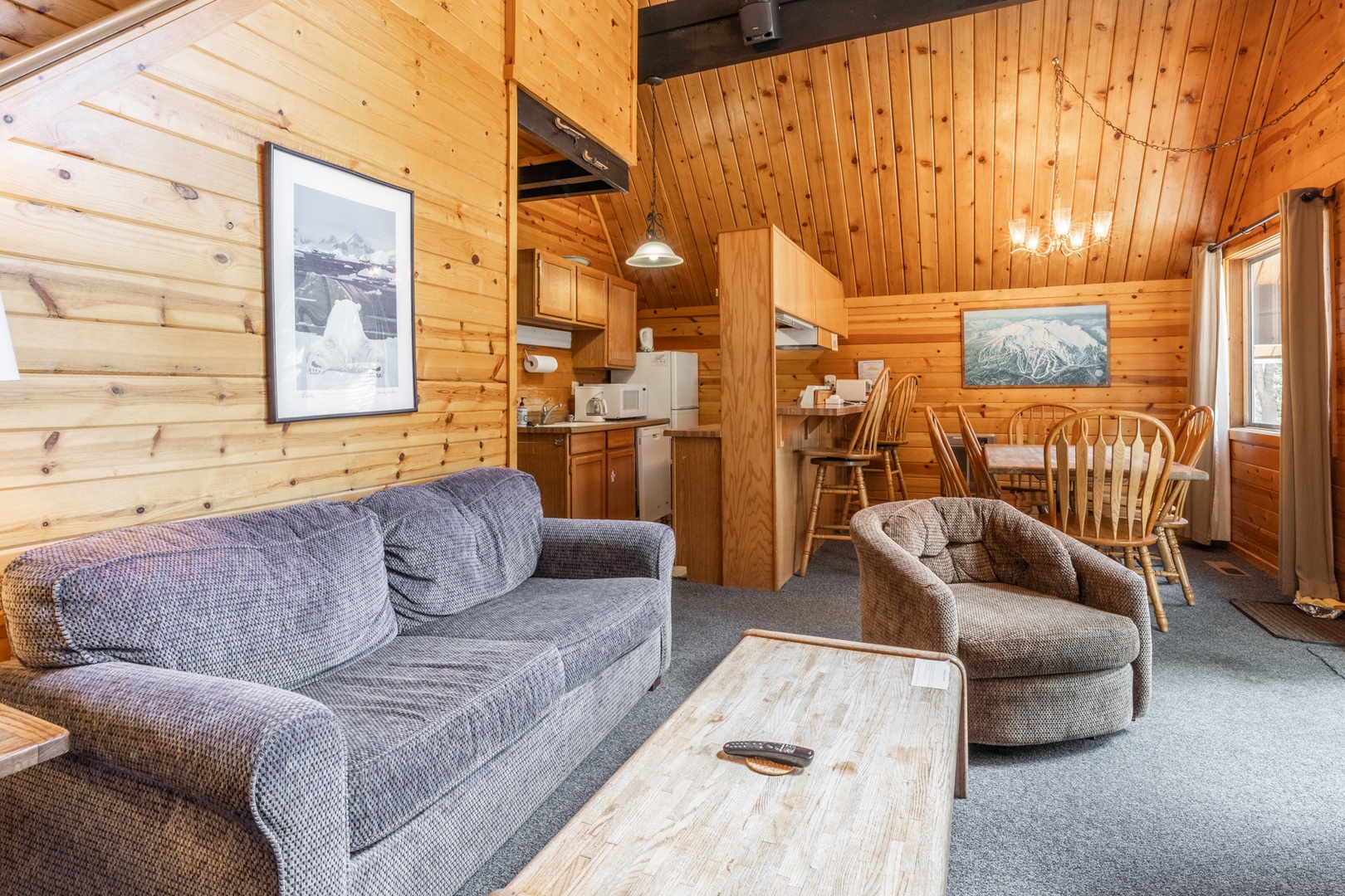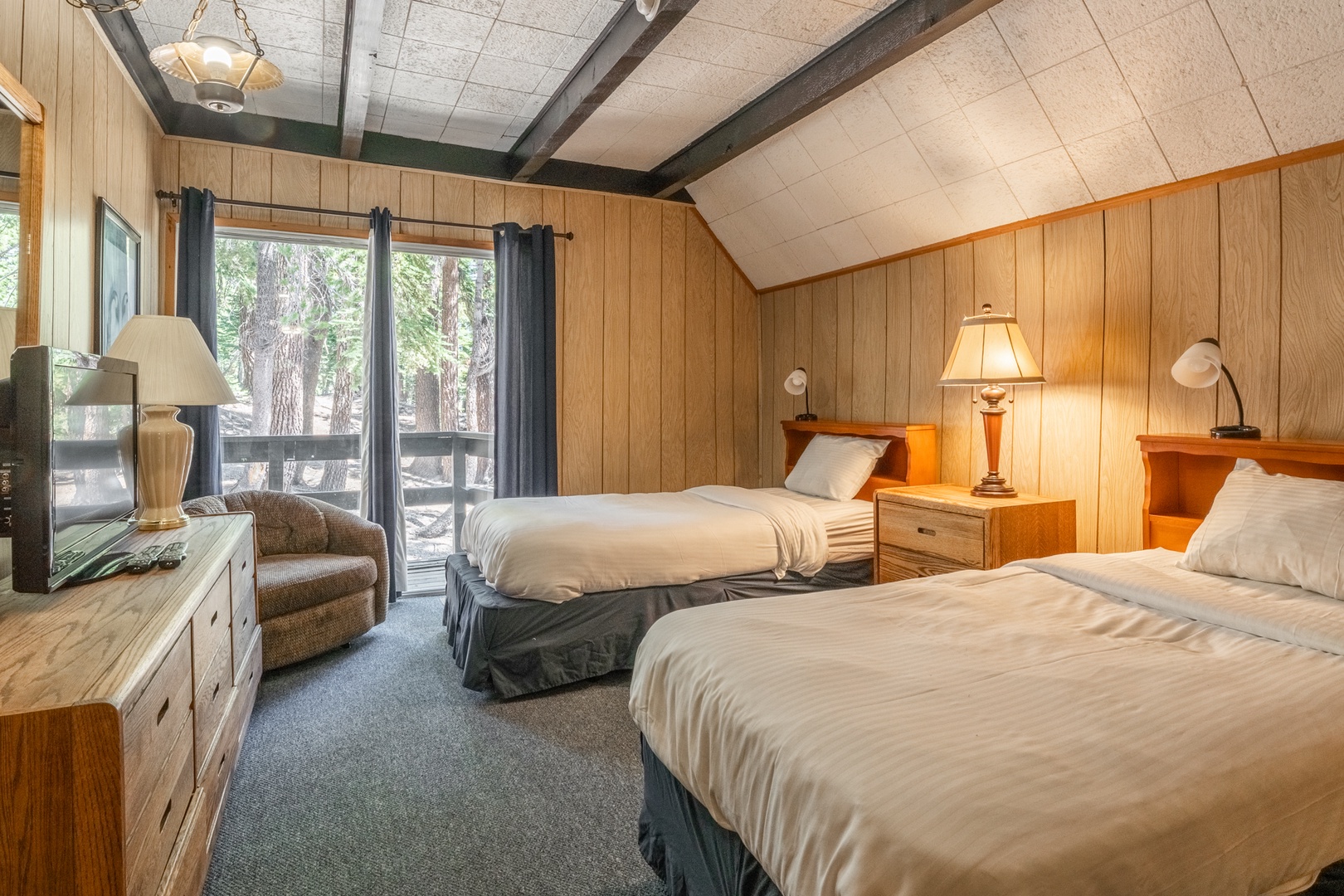 This Chalet is categorized as one of our Medium size units. This is a kid friendly, pet friendly unit! It has 3 bedrooms and 2 bathrooms. Upstairs, there is 1 bedroom with a 2 Twin beds and full bathroom. Downstairs, there is a full bathroom as well as 1 bedroom with a King bed, and another bedroom with 2 Twin beds. Additionally, there is a Queen sofa-bed in the living room. You can enjoy the fully equipped kitchen, dining area, and living room with a wood burning stove and flat screen TV with Cable, DVR, and DVD. This unit is Pet Friendly and has a washer and dryer.