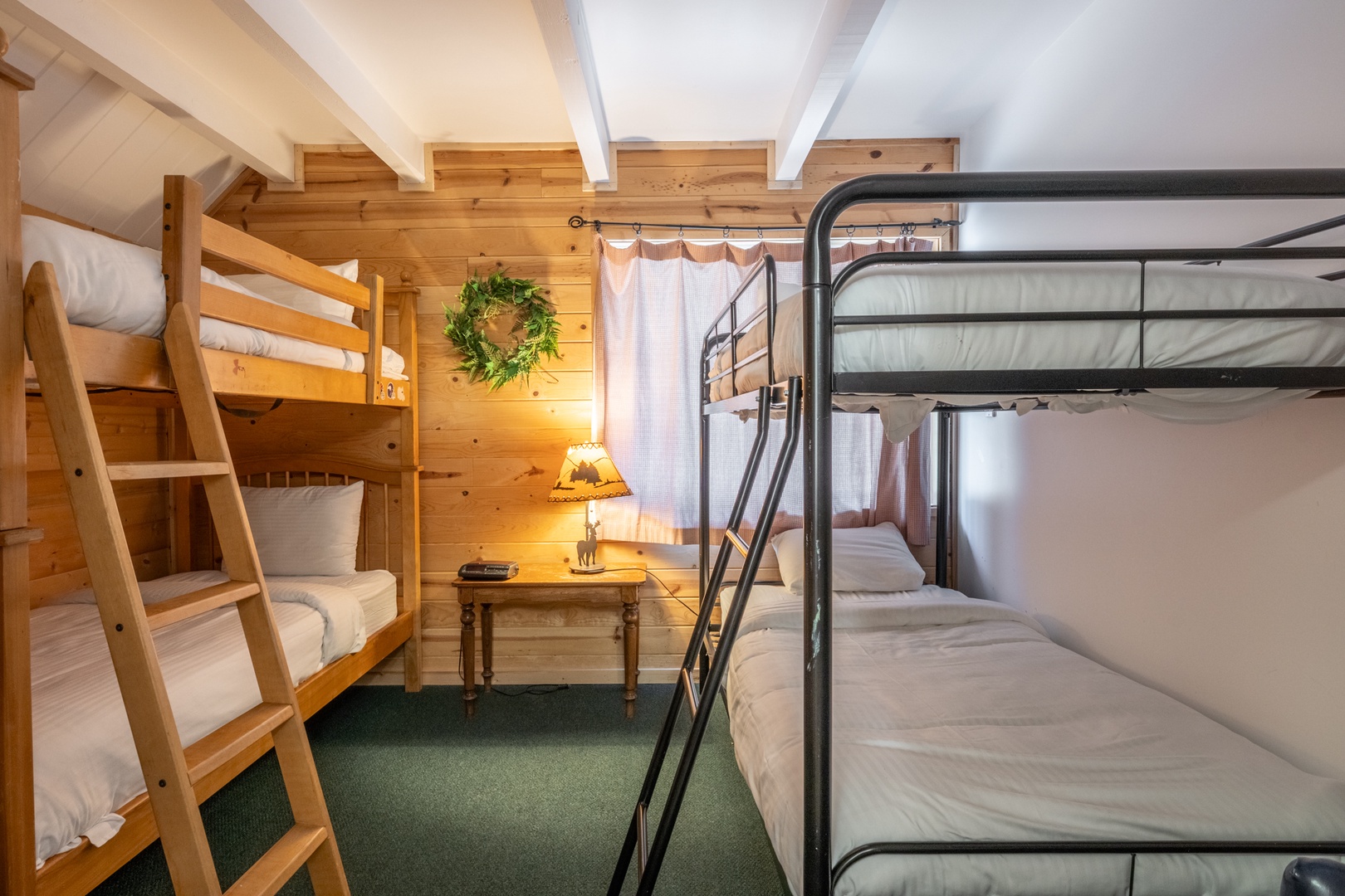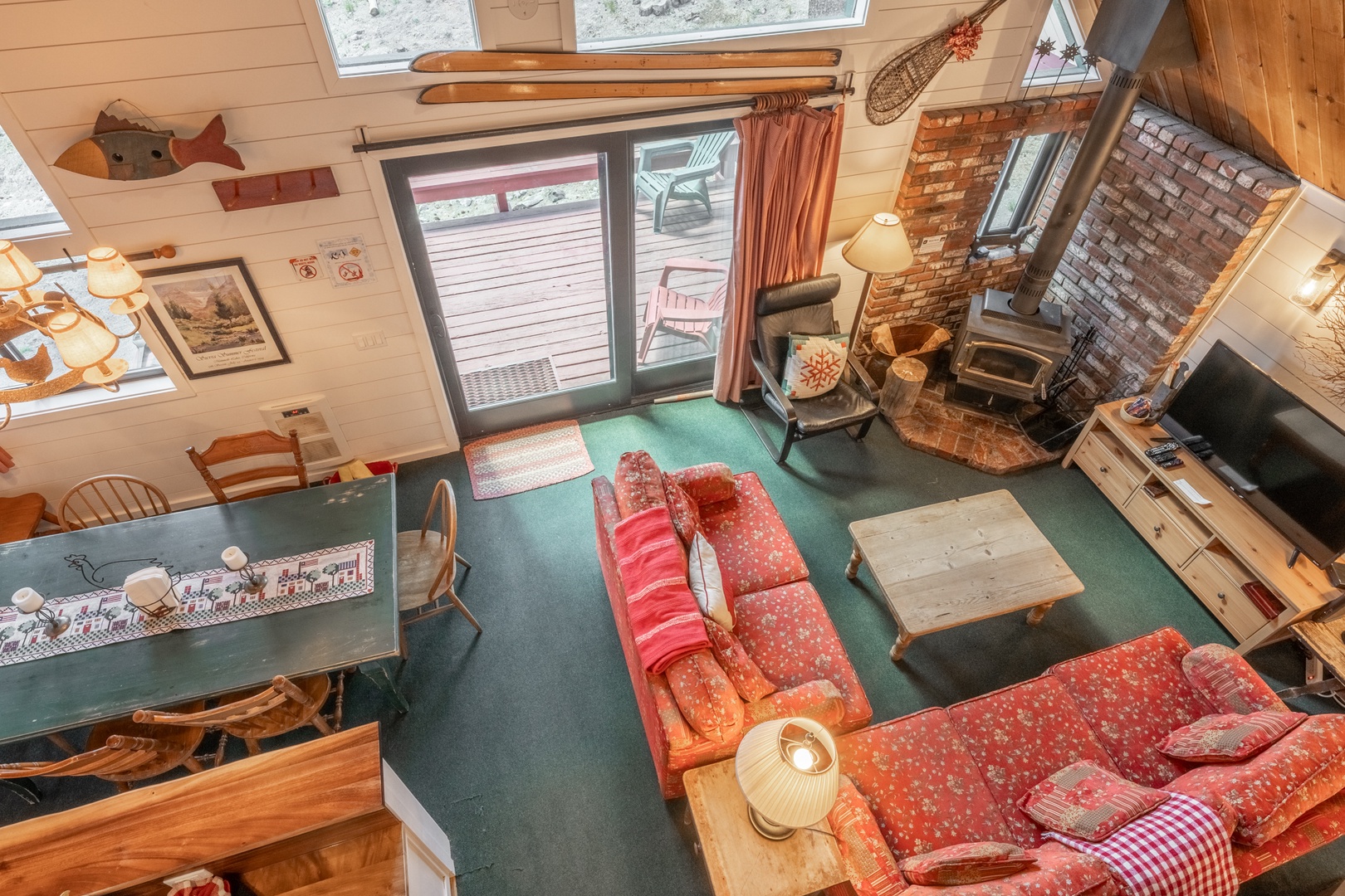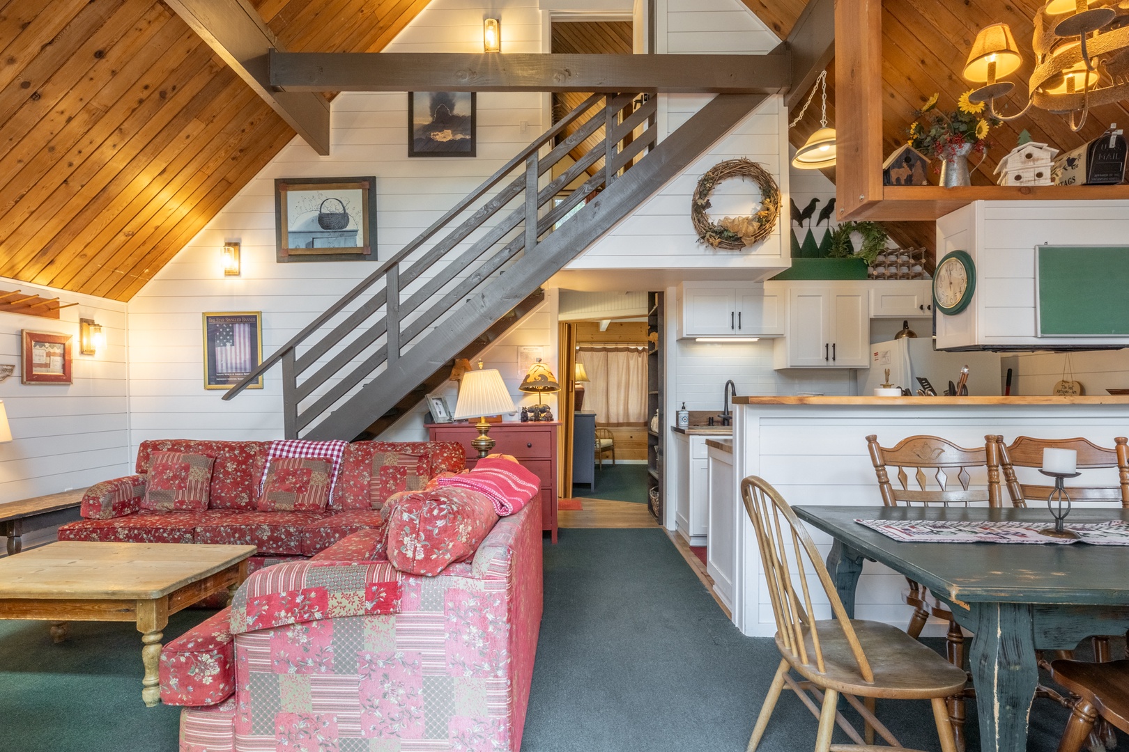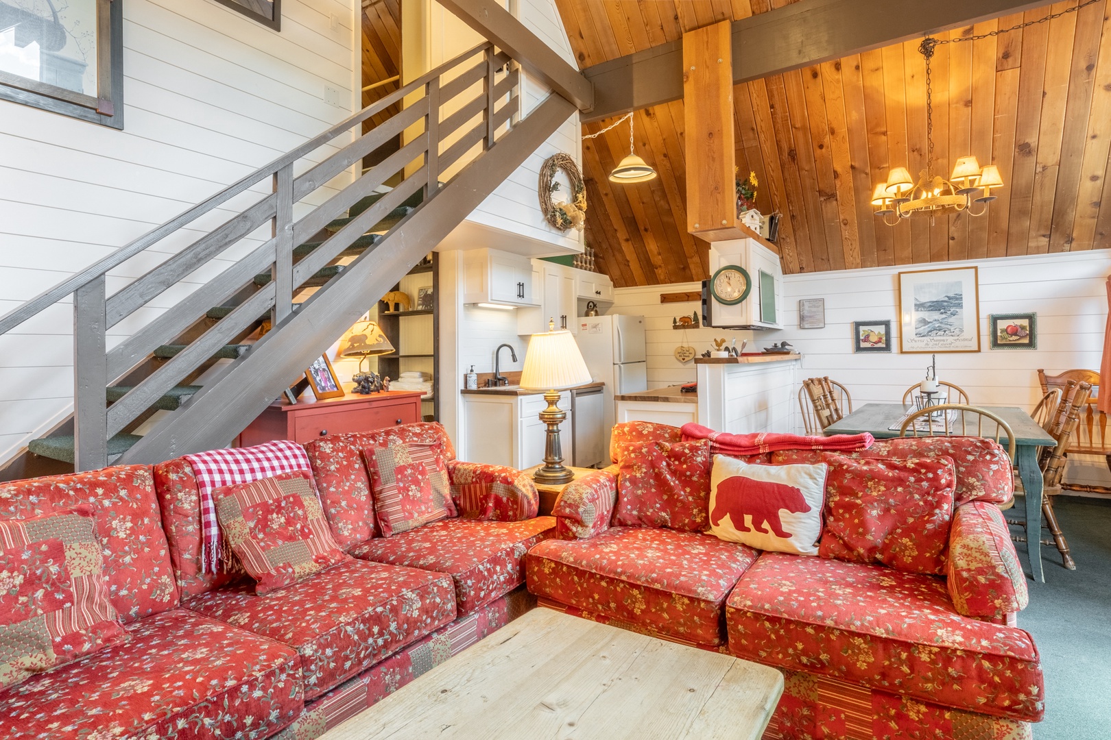 This charming Chalet is categorized as one of our Medium size units and enjoys a large deck and view of the mountain. It has 3 bedrooms and 2 bathrooms. Upstairs, there is 1 bedroom with a Queen bed and full bathroom. Downstairs, there is a full bathroom as well as 1 bedroom with a Queen bed, and another bedroom with 2 bunk beds with Twin beds, 4 twins total. Additionally, there is a Twin size rollaway bed if desired. You can enjoy the fully equipped kitchen, dining area, and living room with a wood burning stove and flat screen TV with Cable, DVR and DVD. This unit is Pet Friendly. You are allotted 2 parking spots in the winter. No limit in the summer.